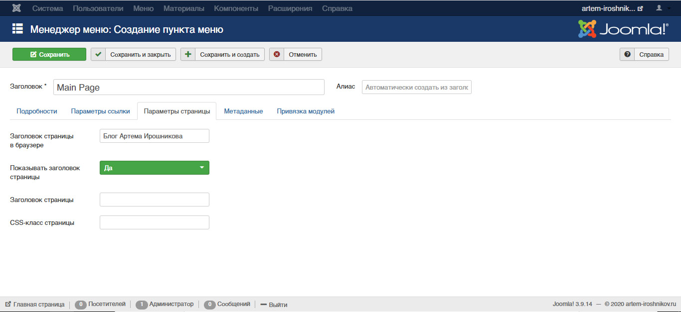В менеджере меню нажимаем слева сверху кнопку «Создать»